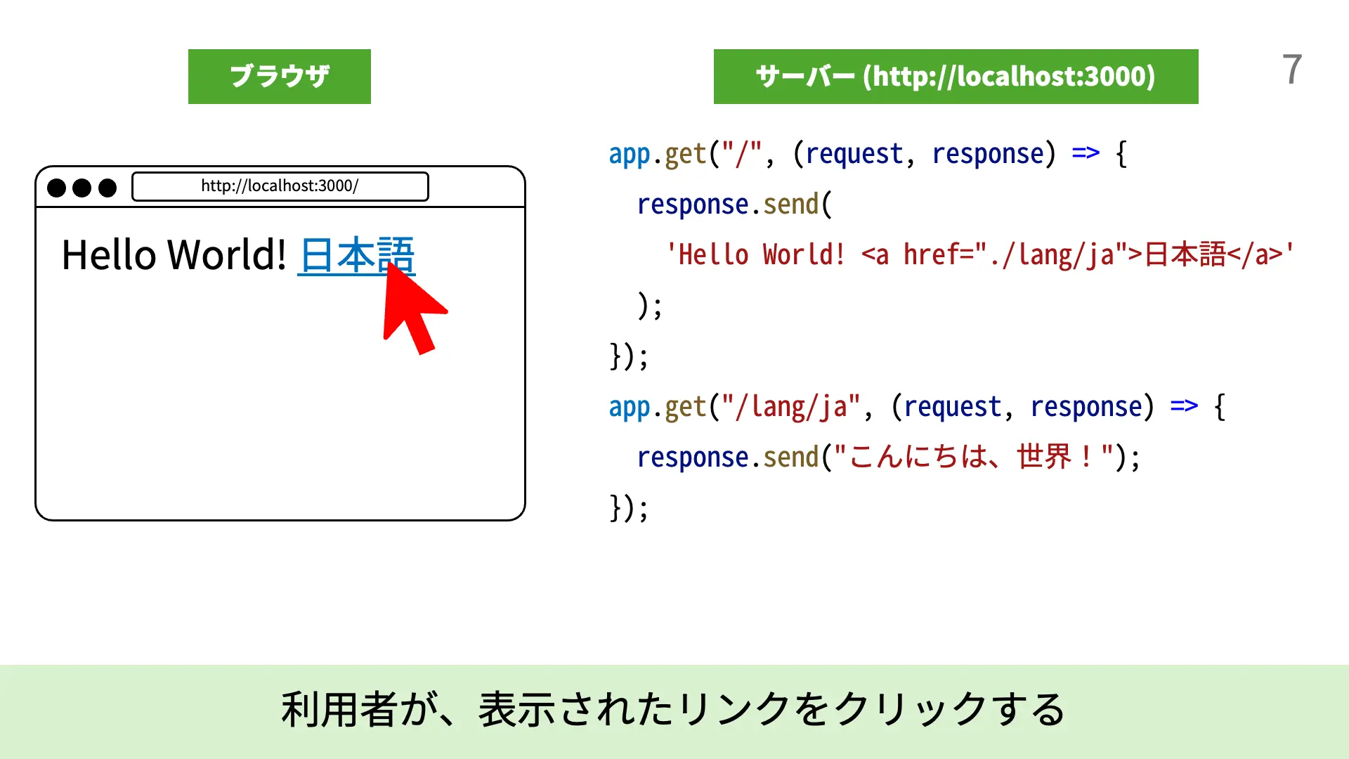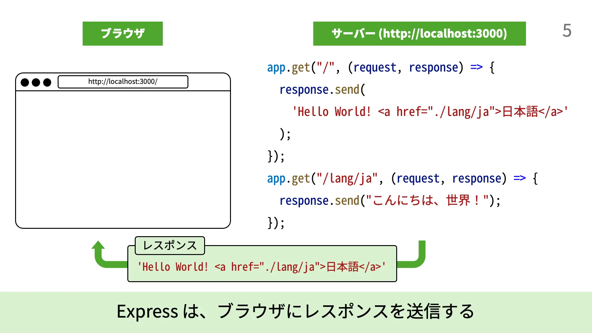 4. [5行目]response.send(`...`);により、Expressは`Hello World! <a href="./lang/ja">日本語</a>`という文字列をレスポンスとして送信します。